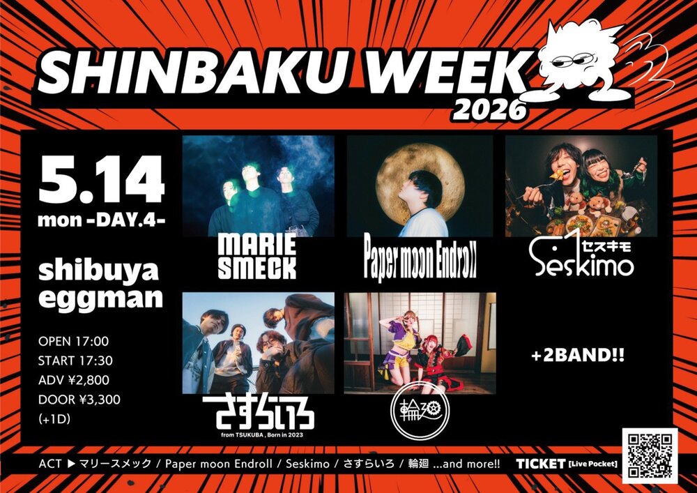 SHINBAKU WEEK 2026 -DAY.4- スケジュール 2026/05/14(木) 渋谷eggman 渋谷eggman!! 心臓、爆発させるぞ〜〜〜〜!!! チケットはこちら💖 URLをコピーする 報告する