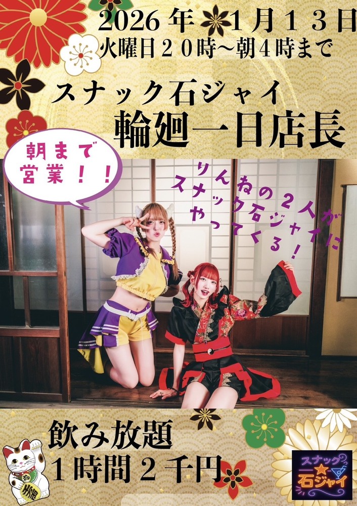 『スナック石ジャイ』 〜輪廻1日店長〜 スケジュール 2026/01/13(火) barアームリカー 地図を表示 スナック石ジャイ お邪魔しまーーーす!!! なんと朝まで…!!!飲むぞ!!!みんなで新年会しよう♡ 予約なしなのでフラッと遊びにきてね♡ URLをコピーする 報告する