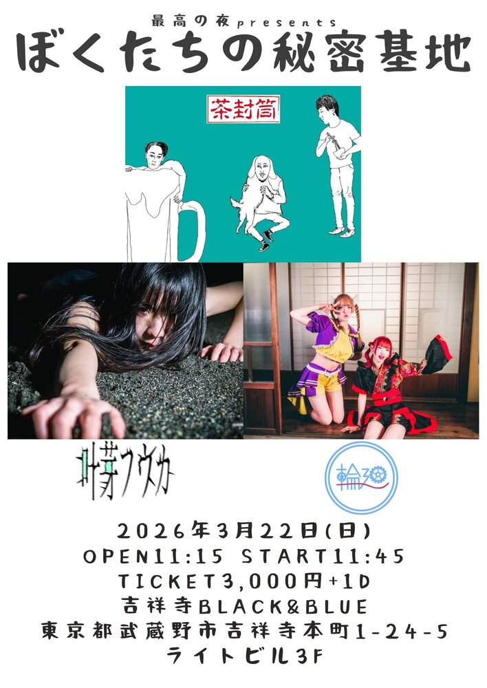 最高の夜presents 「ぼくたちの秘密基地」 スケジュール 2026/03/22(日) 吉祥寺BLACK&BLUE ⏰OPEN 11:15 / START 11:45 ☀️お昼イベント☀️ 🎫¥3,000(+1D) 少し長尺!! 何この最高3マン ご予約はこちら💖 URLをコピーする 報告する