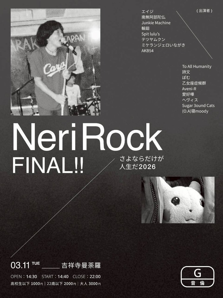 NeriRock FINAL!! ~さよならだけが人生だ2026 スケジュール 2026/03/11(水) 吉祥寺曼荼羅 open 14:30 / start 14:40 / close 22:00 Ticket(全てドリンク代別)高校生以下 1000円22歳以下 2000円大人 3000円 よしはぐの恩師 荒木先生 主催のライブ✌🏻⭐️ URLをコピーする 報告する