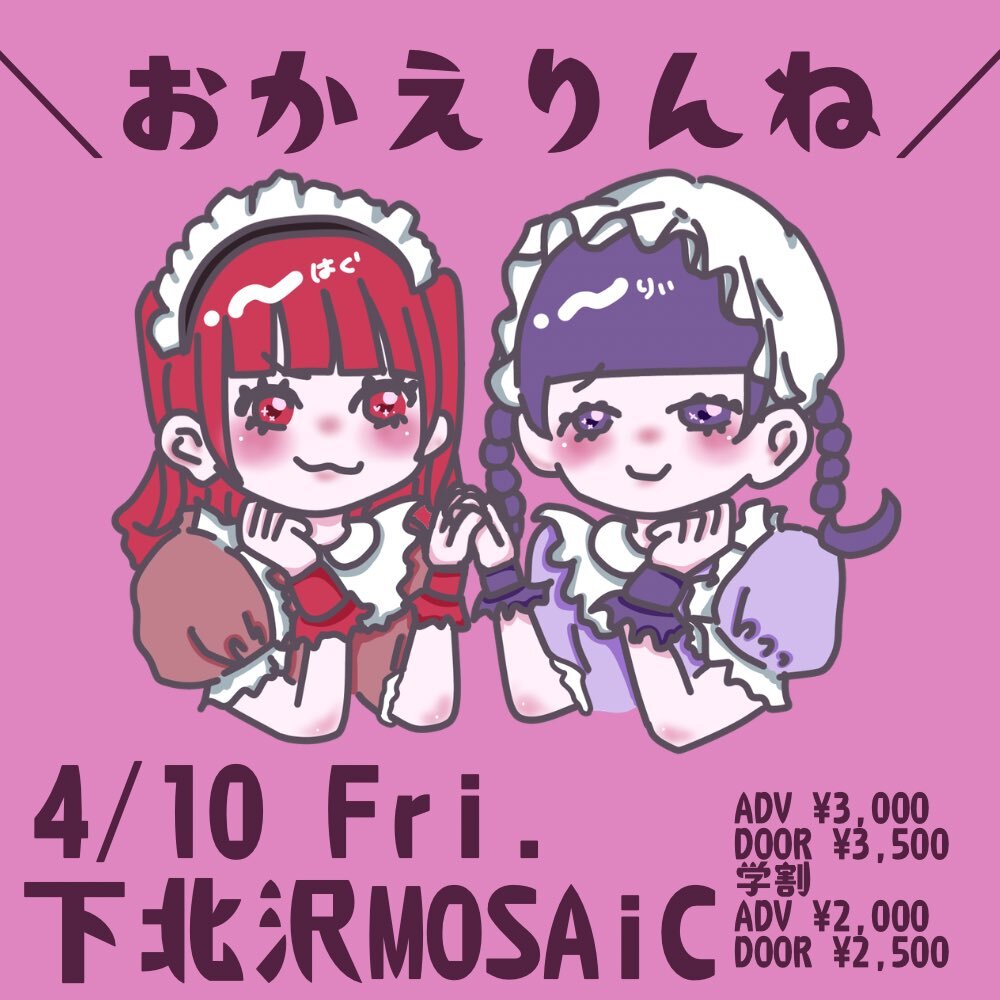 おかえりんね スケジュール 2026/04/10(金) 下北沢MOSAiC ライブ物販にて手売りアリ👑 当日入場順 手売り➡️TIGET➡️当日券 対バンは後日発表⭐️ チケットはこちら⭐️ URLをコピーする 報告する