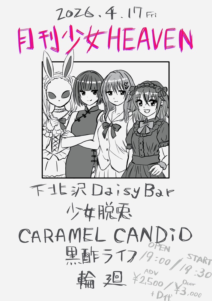 少女脱兎2周年ライブ 「月刊少女HEAVEN」 スケジュール 2026/04/17(金) 下北沢DaisyBar /𝑳𝑶𝑽𝑬 少女脱兎お祝いしに行くよ💖\ 🗓️4/17(金)📍下北沢DaisyBar open19:00 / start19:30🎫ADV ¥2,500 / DOOR ¥3,000(+1D) チケットはこちら🎫 URLをコピーする 報告する